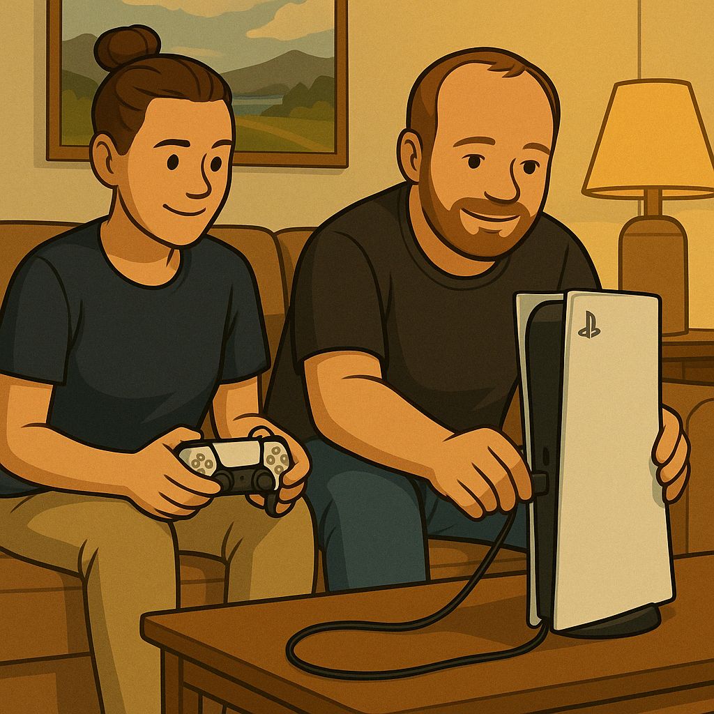 Utover kvelden koblet vi til PS5-en jeg hadde med meg fra Bømlo. Jeg har jo flyttet alt jeg eier og har til et lager i Haugesund. Nå er jeg hjemløs, men jeg kommer jo til å være en god del hos T, så det var naturlig at jeg tok med meg litt ekstra ting hit. T satte pris på å få en PS 5 i hus og satte i gang å spille med en gang.